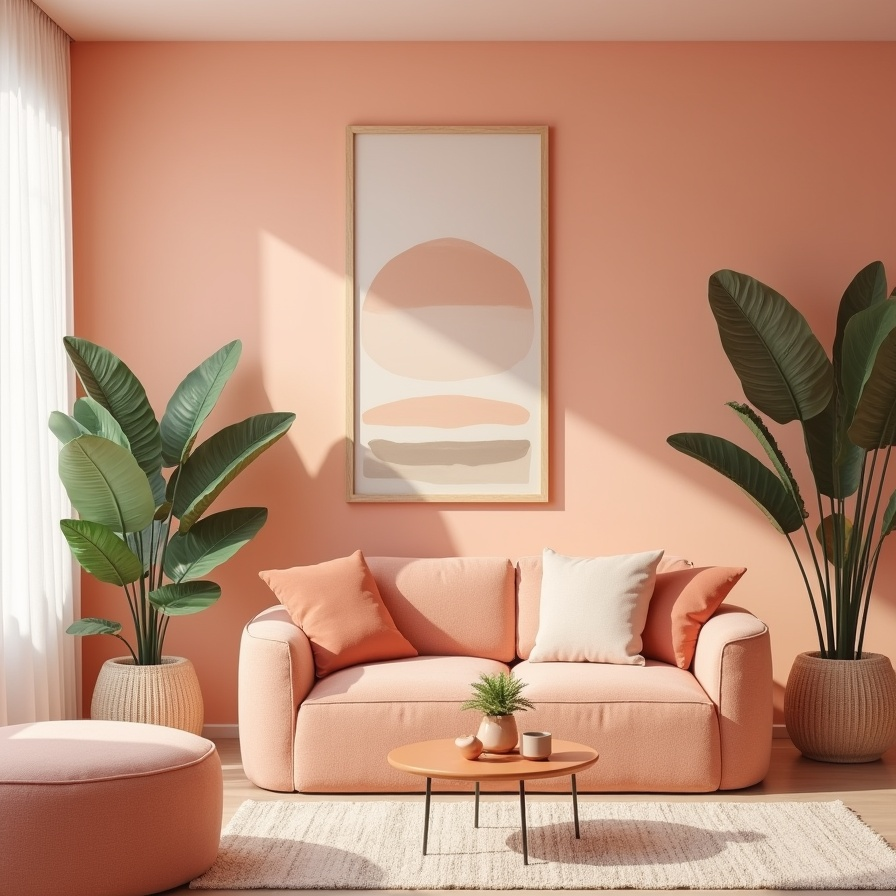 Greenery and subtle gradient artwork introduce depth and prevent the palette from feeling overly sweet. The rounded furniture shapes enhance the softness of the design. Altogether, this peach-toned room strikes a beautiful balance between playful and peaceful, making it a comfortable retreat for everyday living.