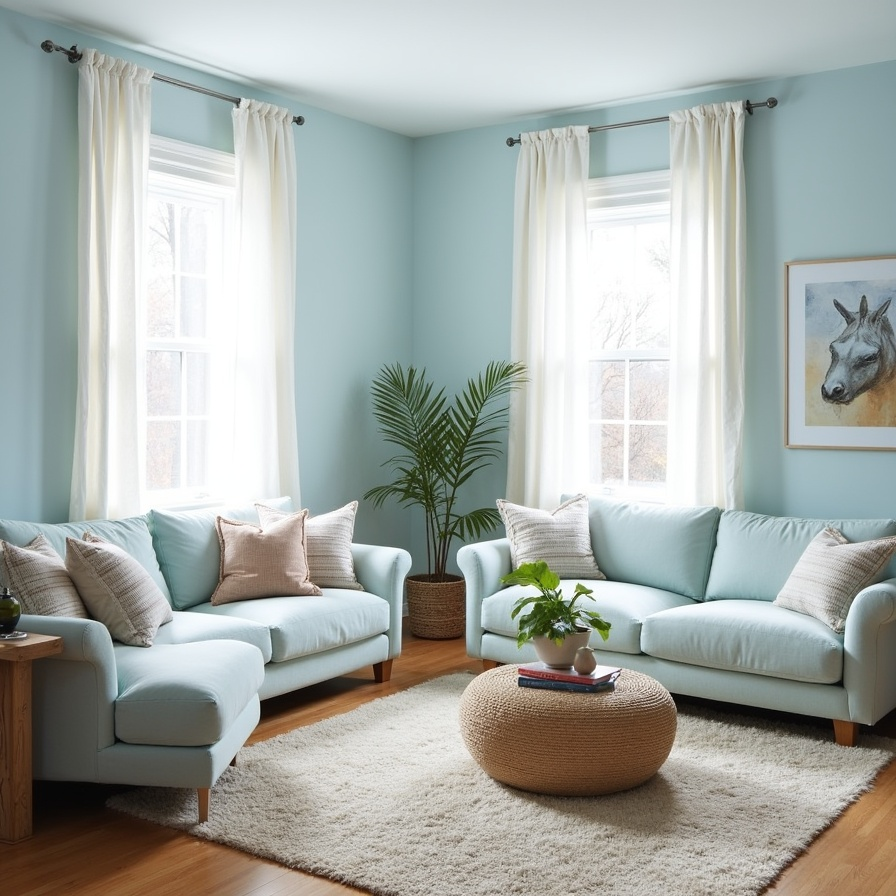 Powder blue has an inherently soothing quality, making it ideal for a monochromatic living room. With cool-toned walls, curtains, and seating, the space feels airy and serene. The consistent shade creates a seamless flow that enhances the sense of openness.