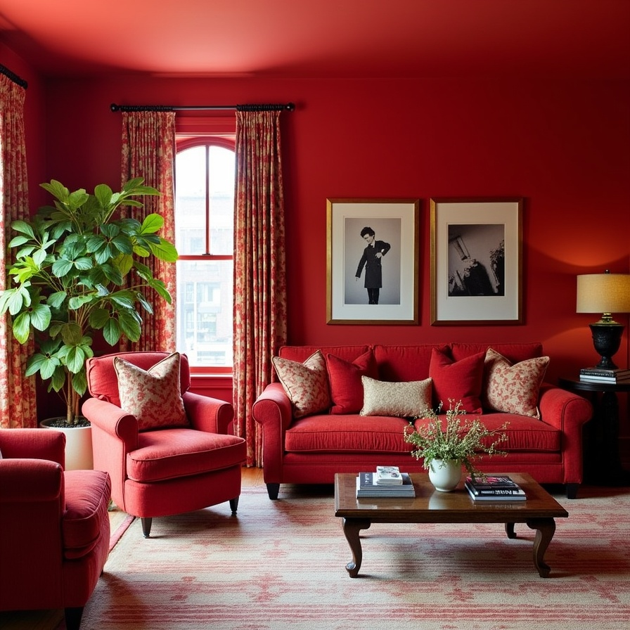 Green plants and black-and-white framed photos provide visual breaks that balance the vibrancy. The layered textiles add comfort and warmth. This design shows that embracing a powerful color wholeheartedly can create a lively yet inviting environment.