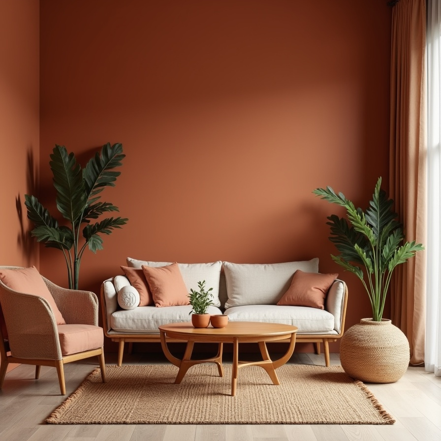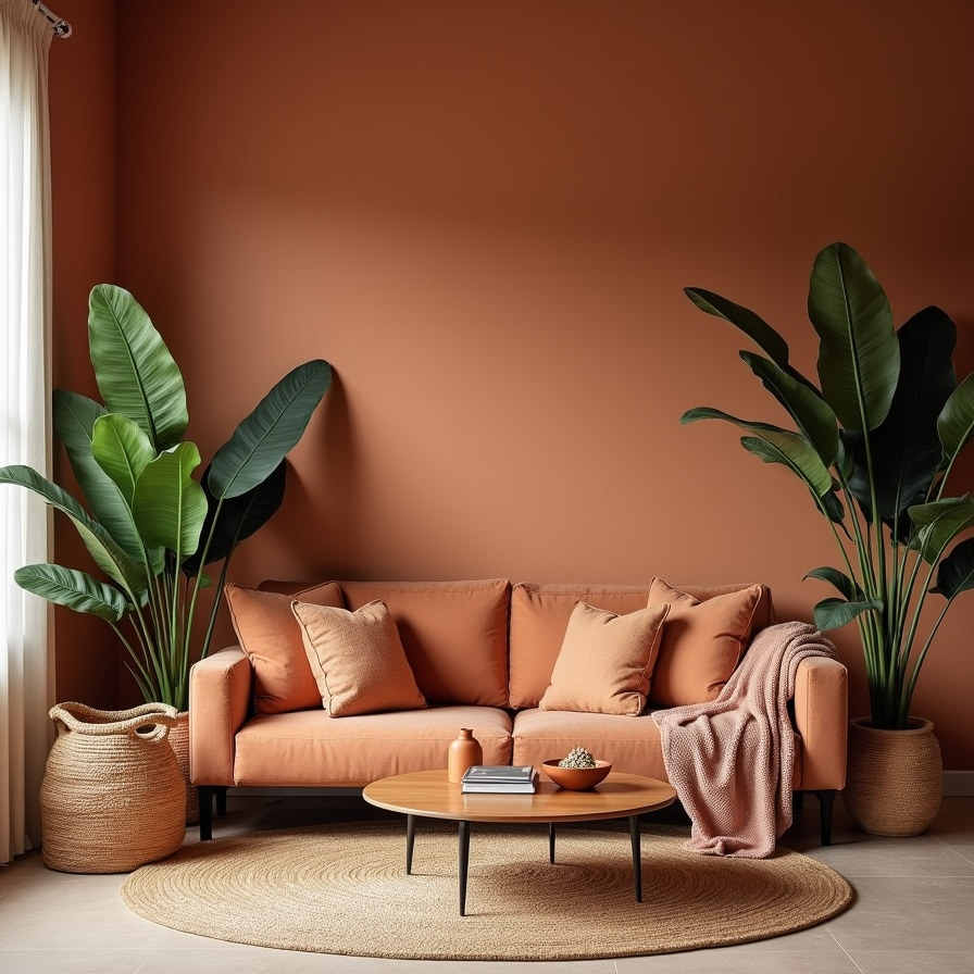 Terracotta once again proves its versatility in this warm and cohesive living space. The walls, sofa, and decorative elements all share the same earthy tone, creating a comforting and unified design. The color feels natural, inviting, and timeless.