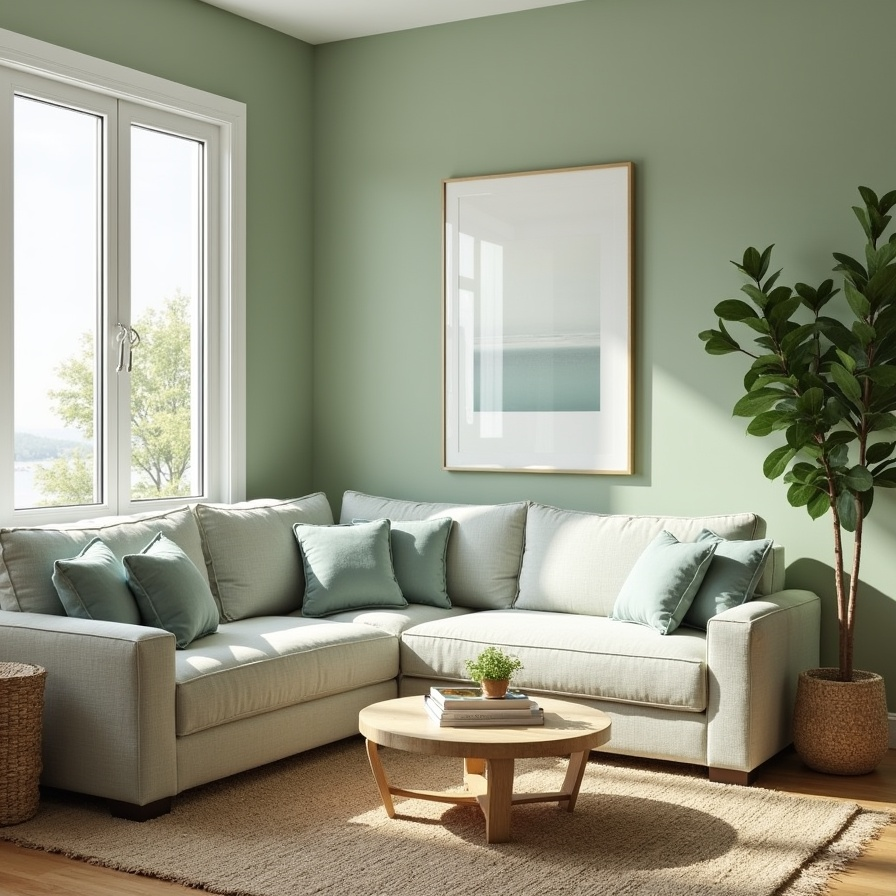 Sage green offers a muted, calming alternative to brighter shades. In this living room, the soft green walls and matching sectional create a tranquil, cohesive environment. The gentle hue feels fresh and grounding at the same time.