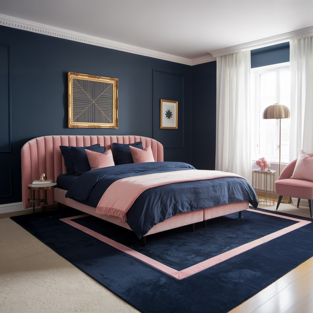 This bedroom shows that dark, moody colors can feel soft and inviting rather than heavy. Inky navy walls set a dramatic backdrop, while a blush velvet bed brings warmth and a sense of romance, like silk illuminated by candlelight.