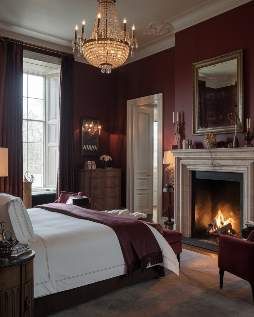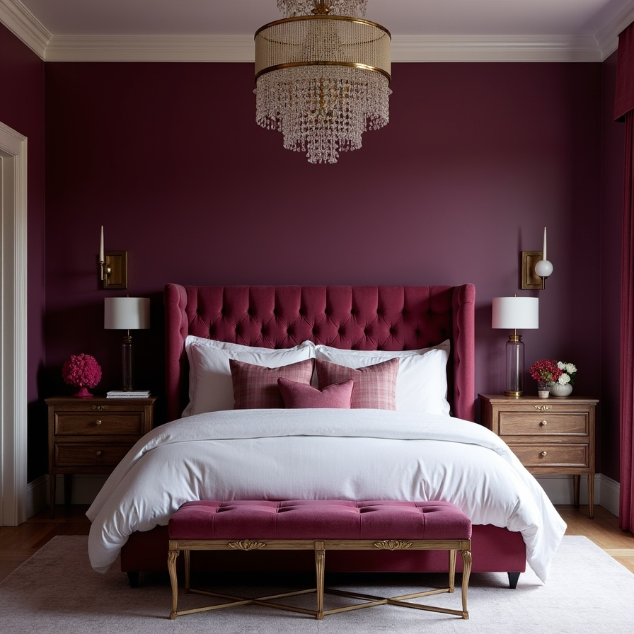 Deep, saturated plum walls define this bedroom with an air of elegance. A tufted headboard and cascading chandelier give it a cinematic, boutique-hotel quality, evoking decadence without overwhelming the senses.