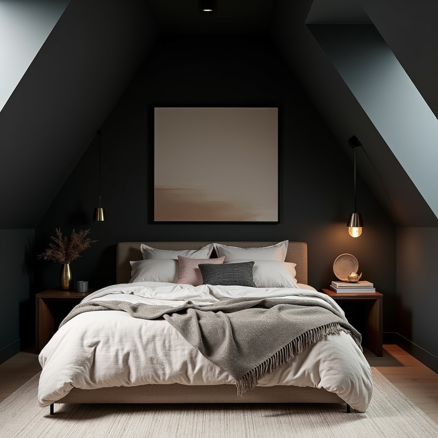 Quietly powerful and introspective, this attic bedroom thrives on subtlety. Dark charcoal walls create intimacy, while layered textiles and muted artwork add dimension without crowding the room.