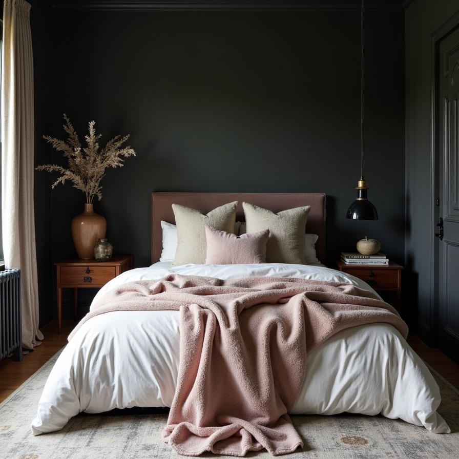 This bedroom pairs dark walls with soft, neutral accents for a harmonious effect. Charcoal tones give the space weight, while warm textures and plush bedding make it inviting and restful.