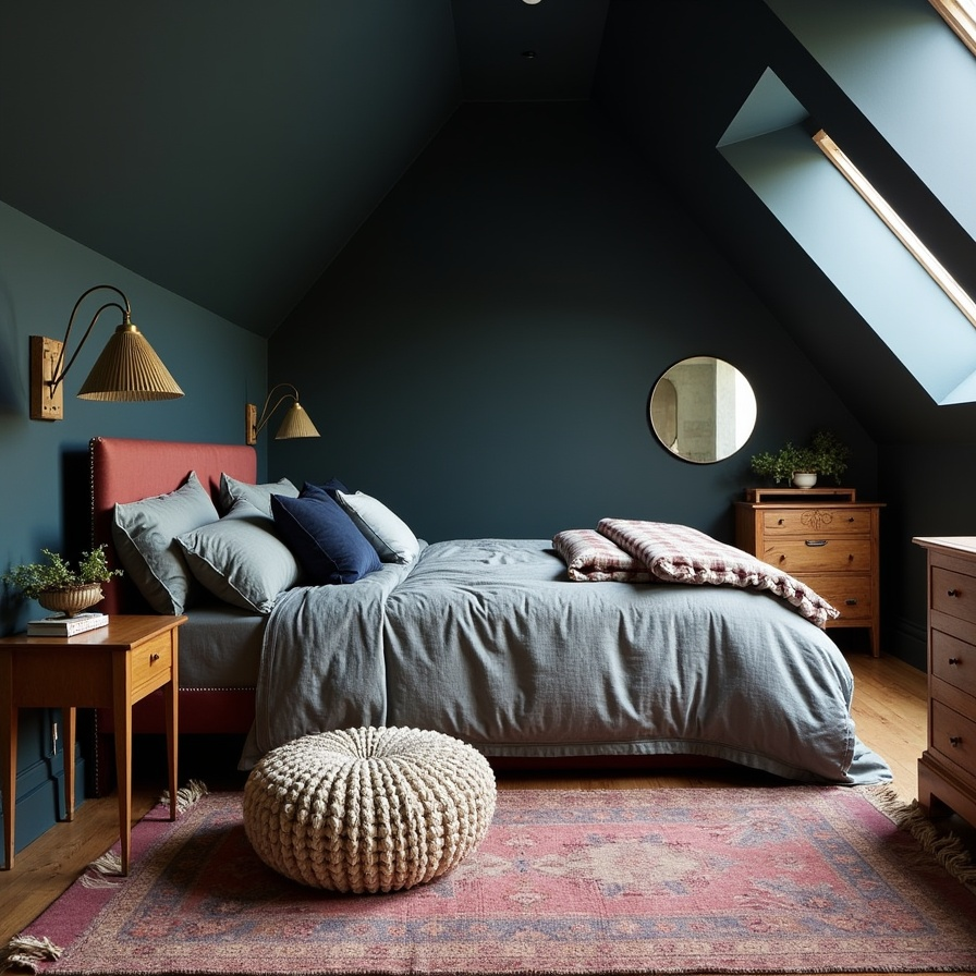 Classic design meets moody elegance in this attic bedroom. Deep, inky walls, traditional furniture lines, and layered rugs create a timeless, soulful space.
