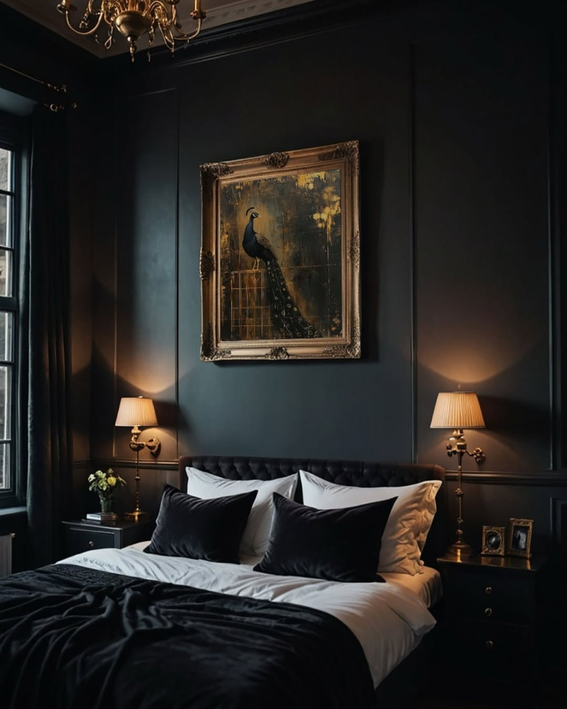 The room isn’t about looking pretty; it’s about evoking feeling. Perfect for anyone drawn to darker palettes with an edge of intrigue and ceremony.