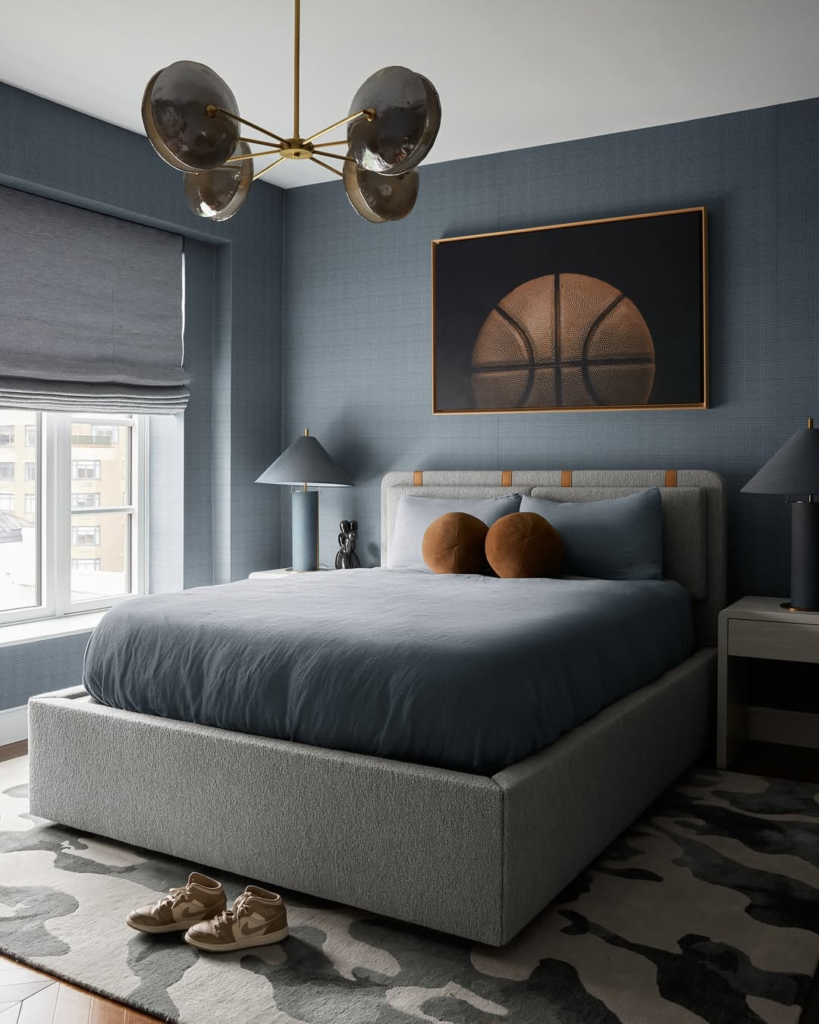 Editorial yet approachable, this bedroom balances muted dark walls with sculptural lighting and tailored bedding. The design exudes quiet confidence and style without feeling intimidating.