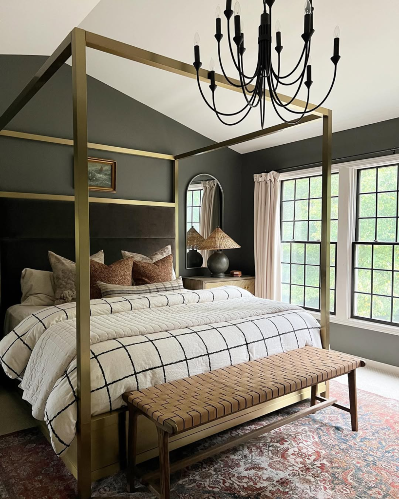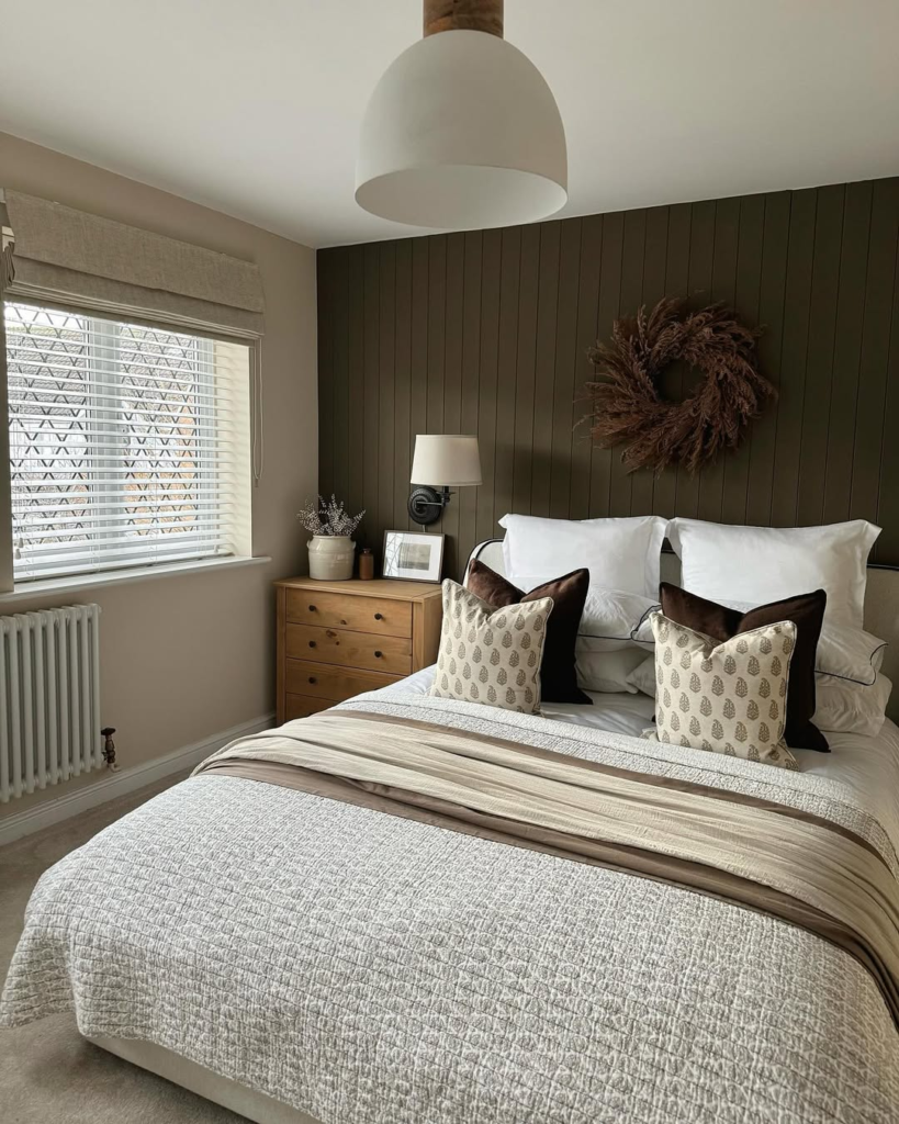 This bedroom shows that dark tones don’t always mean dramatic intensity. Muted walls paired with light bedding and warm neutrals create a space that’s cozy, feminine, and deeply relaxing.