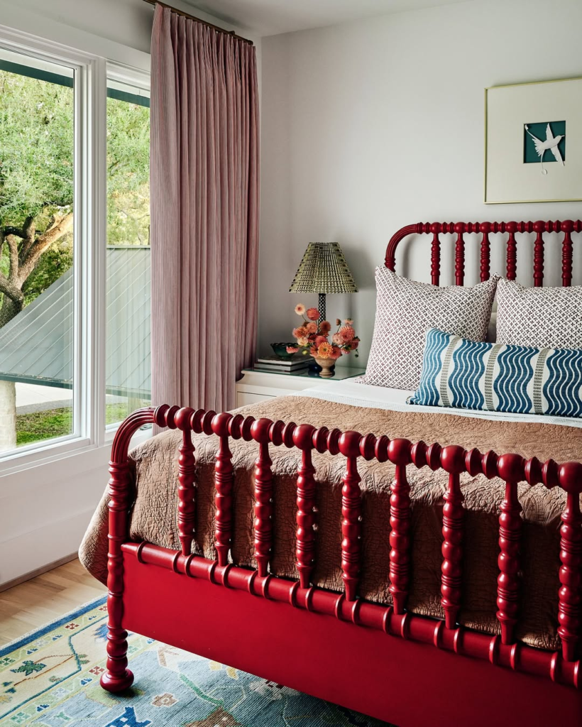 The secret to this room’s success is balance. Gentle curves, gold accents, and layered pale pink textiles create a luxurious yet personal atmosphere. It’s romantic without being overly sweet and moody without feeling gothic—a space designed to feel intimate and welcoming.