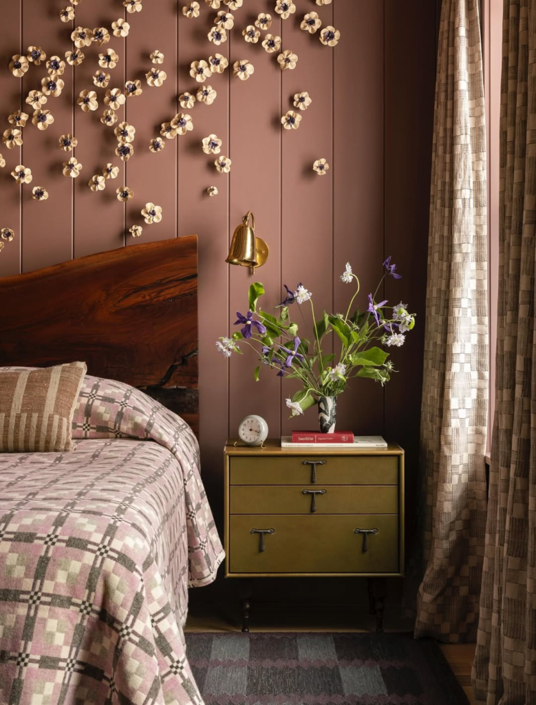 Deep tones and romantic details meet vintage-inspired furniture in this bedroom, creating a layered, soulful space. Soft textures and careful styling keep the room dreamy and approachable.
