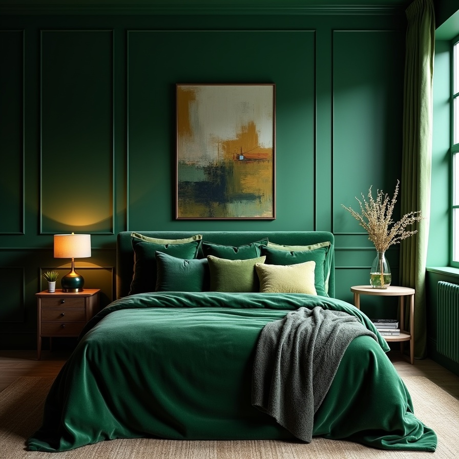 Walking into a bedroom painted in deep, dark green feels like stepping into a private retreat. The rich hues immediately create a sense of calm, enveloping the space in a luxurious, restful embrace. Abstract artwork against the walls adds personality, creating visual interest while maintaining the room’s elegance.