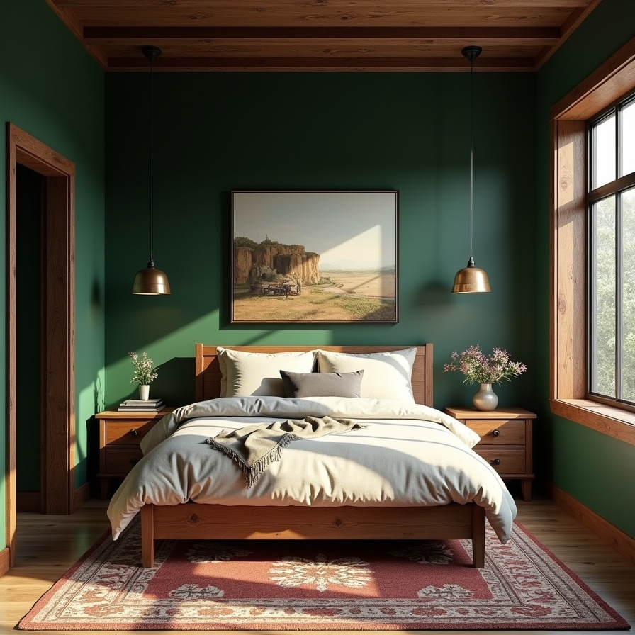 Dark green walls set the stage for a bedroom that blends rustic warmth with timeless elegance. A landscape painting above the bed adds a hint of history, giving the room a cultured and artistic touch.