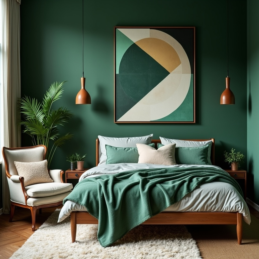 In this modern take on a dark green bedroom, geometric artwork becomes a focal point, contrasting beautifully with the deep green walls. The shapes and patterns bring energy to the space, making it feel dynamic yet cohesive.