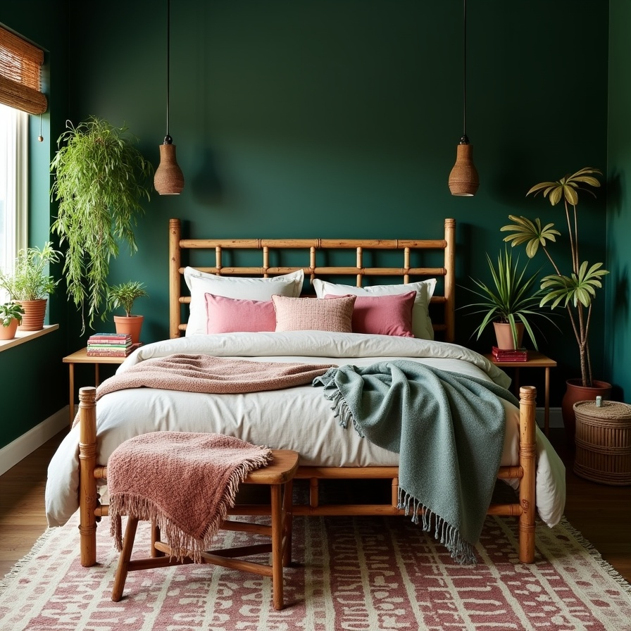 Deep green walls offer a comforting and sophisticated foundation for a bedroom designed for rest and relaxation. A bamboo bed frame, rustic lighting fixtures, and layered textures bring warmth and organic appeal.