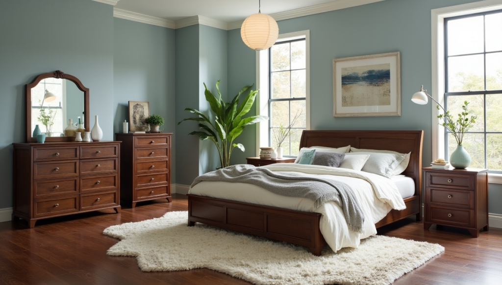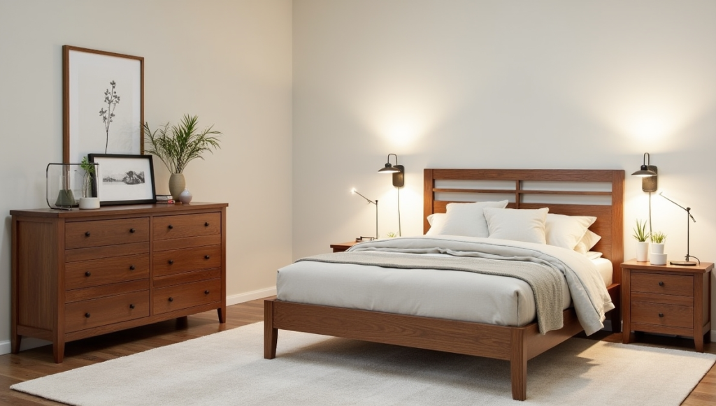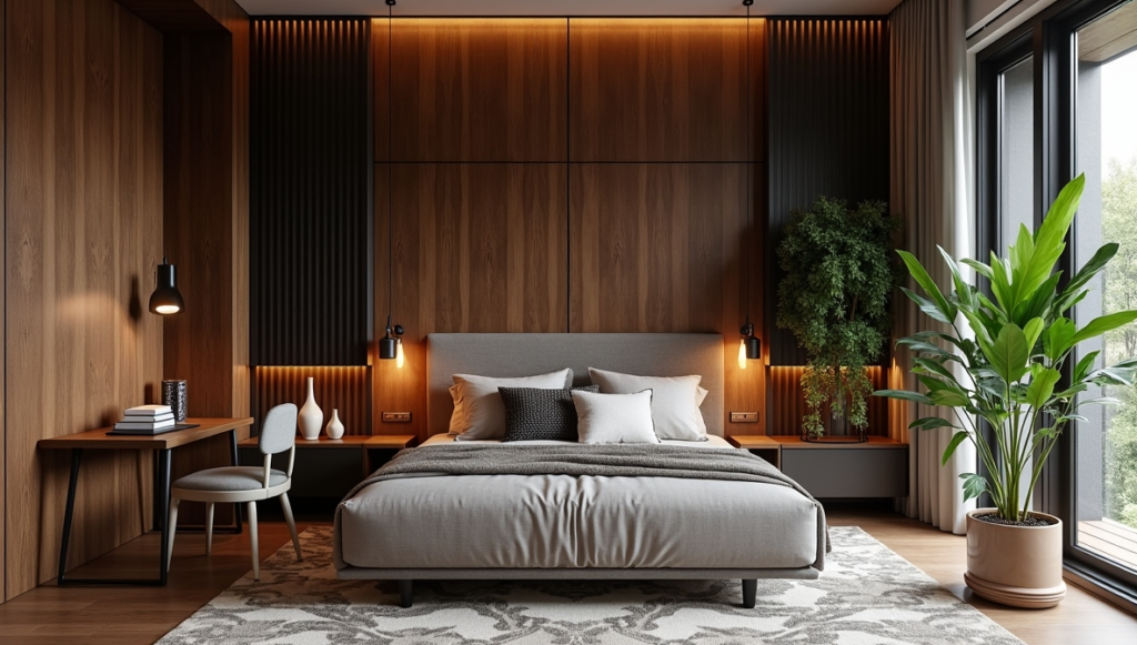 Layering lighting—table lamps, pendant lights, or subtle wall sconces—enhances the wood’s natural grain and adds ambiance. Complement the palette with muted colors, metallic accents like brass or gold, and natural elements such as greenery or woven rugs. The result is a sophisticated bedroom that’s both inviting and serene.