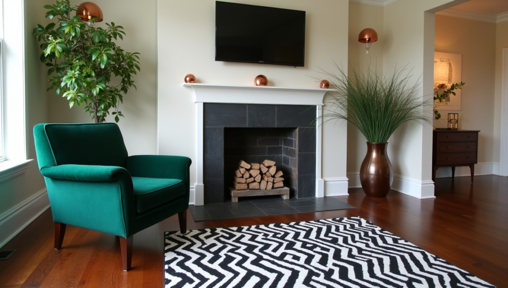 The polished dark wood flooring gleams under the subtle light, anchoring the space with elegance. A striking black-and-white geometric rug lays across the floor, injecting visual interest and modern flair. Complementing the floor, a dark wood side table with clean lines follows the mid-century modern aesthetic, harmonizing both style and functionality.