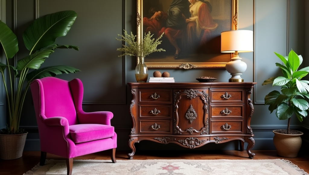 A vividly upholstered fuchsia chair punctuates the room with bold color, creating a playful yet elegant contrast against the darker wood and muted background. Surrounding greenery softens the space and adds natural energy, enhancing the overall balance between past and present.