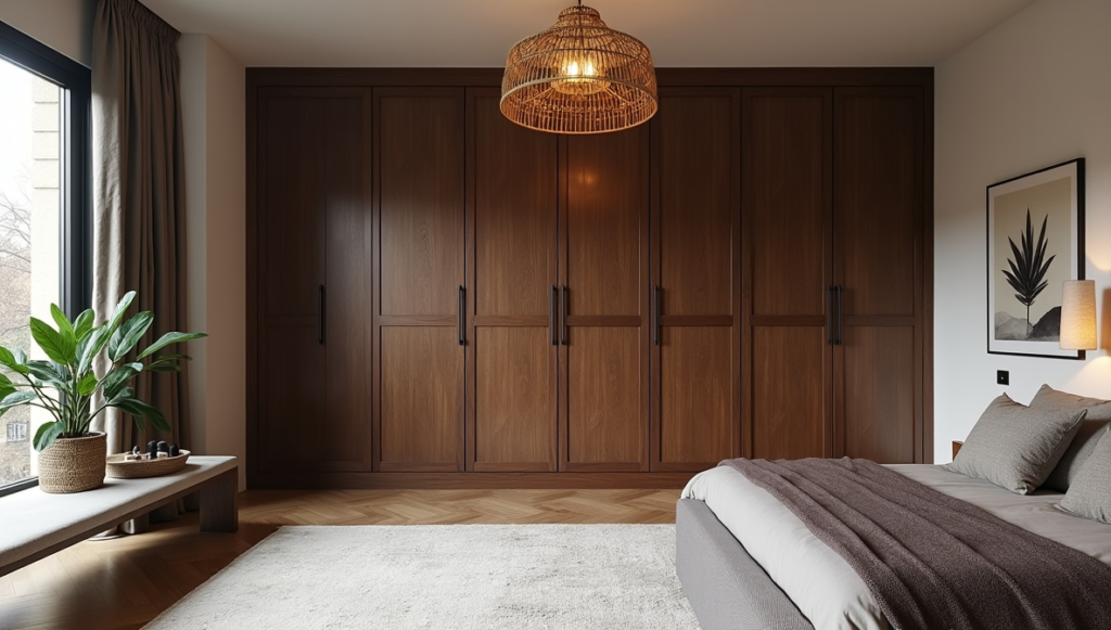A grand dark wood wardrobe becomes the room’s focal point, offering both storage and a sense of artisanal craftsmanship. Its sturdy presence grounds the space while highlighting the beauty of natural materials. Across the room, a sleek dark wood bench provides a modern counterpoint, merging functionality with visual appeal.