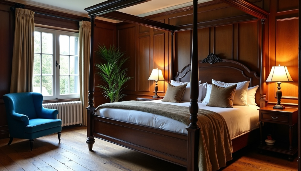 A four-poster dark wood bed dominates the space, its grandeur reflecting historical design while grounding the room in warmth. The aged floorboards beneath the bed reinforce a sense of history and authenticity, enhancing the bedroom’s inviting atmosphere.