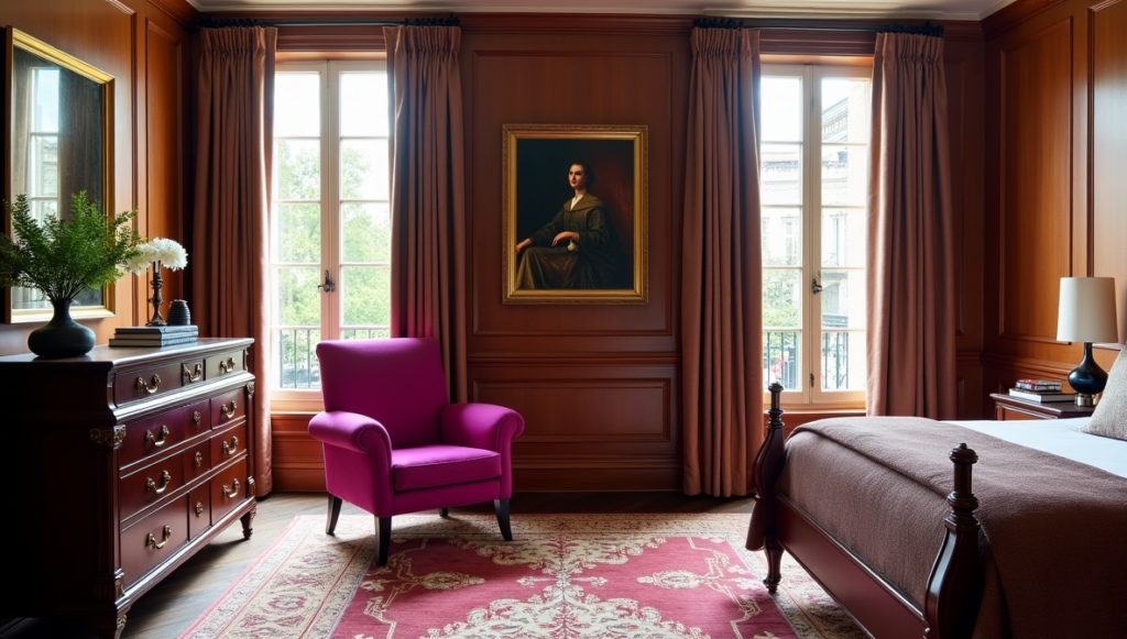 A bold magenta statement chair injects color and contemporary style, contrasting with the traditional wood tones. Floor-to-ceiling curtains accentuate the room’s height while framing natural light, adding drama and a sense of scale.