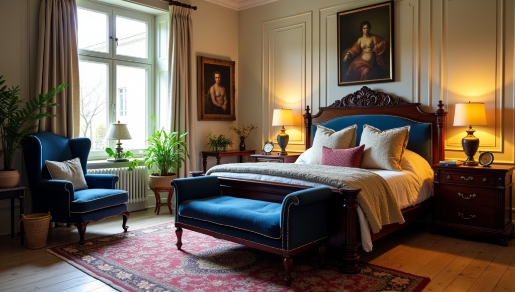 Rich textures and vibrant accents are balanced throughout the space. An intricate rug in shades of red and cream complements the dark wood, while a leafy plant introduces freshness. A framed classic painting enhances the historical ambiance, creating a bedroom that skillfully combines heritage with modern style.