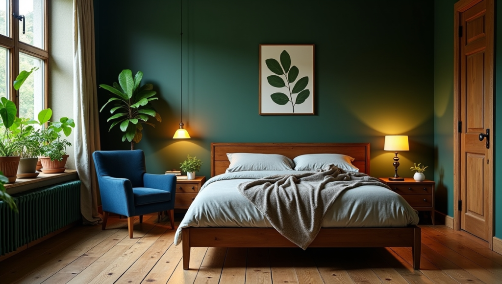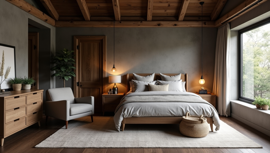 A cozy armchair in muted gray sits beside a sleek nightstand, bridging rustic and contemporary styles. Soft lighting from a minimalist pendant creates a calming atmosphere, highlighting natural wood grains and subtle decorative accents. Small potted plants and woven baskets introduce organic textures, balancing the dark tones with a fresh, airy feel. This blend ensures the room is timeless yet practical.