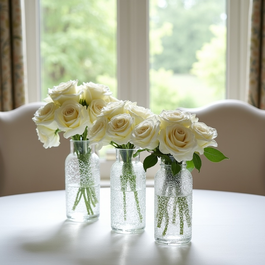 Sunlight enhances the elegance of this dining room, where three crystal vases filled with white roses take center stage. The clear, textured glass reflects natural light beautifully, adding subtle sparkle without overpowering the serene environment.