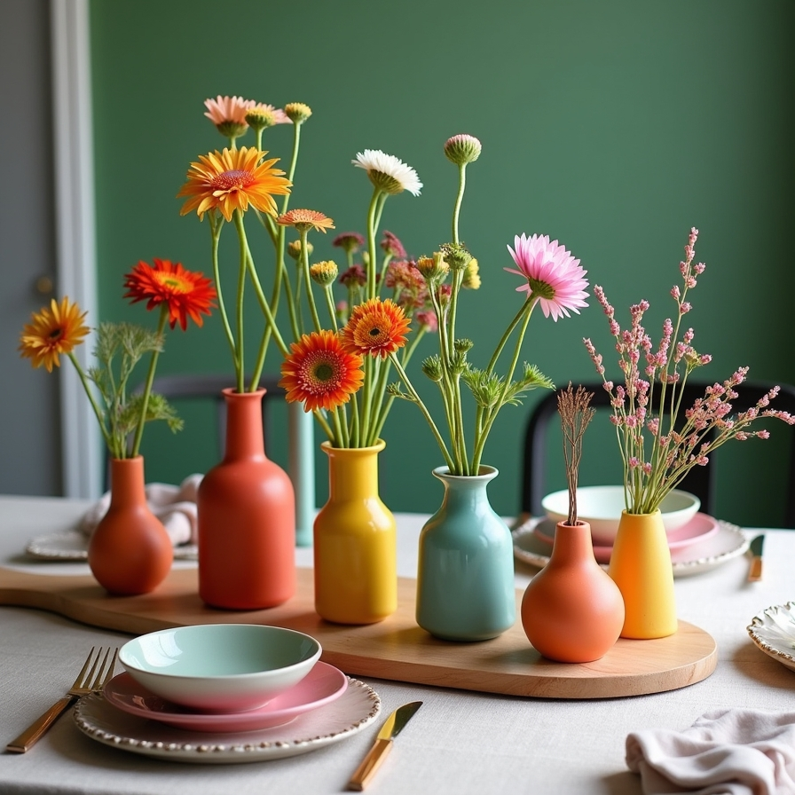 A collection of multicolored ceramic vases brings energy and personality to this lively dining room. Each vessel holds fresh blooms, adding texture and movement to the tabletop.