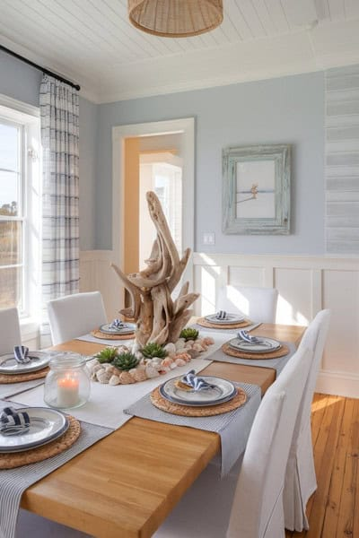 Layered placemats and subtle striped textiles reinforce the coastal mood without appearing overly themed. This design beautifully demonstrates how nature-inspired elements can create calm, welcoming dining spaces.