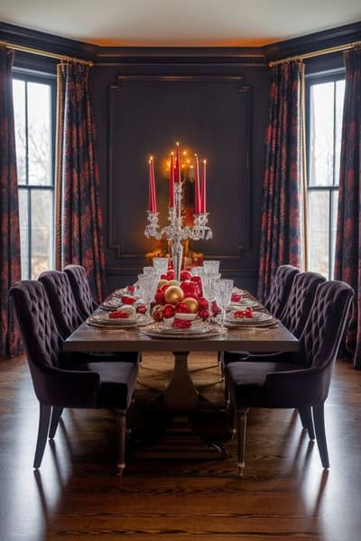 Paired with plush seating and elegant glassware, the arrangement feels festive yet refined. It’s ideal for holiday gatherings where ambiance matters most.