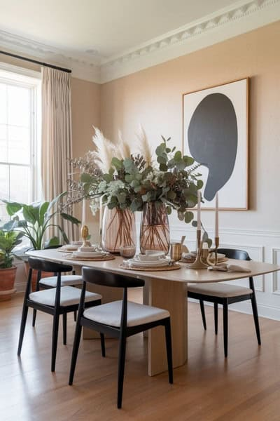 This dining space beautifully demonstrates how a thoughtfully styled centerpiece can redefine an entire room. Tall, sculptural vases filled with pampas grass and eucalyptus instantly add height and texture to the table. The feathery plumes soften the sharp lines of the dining furniture, creating a refined contrast that feels both airy and grounded.