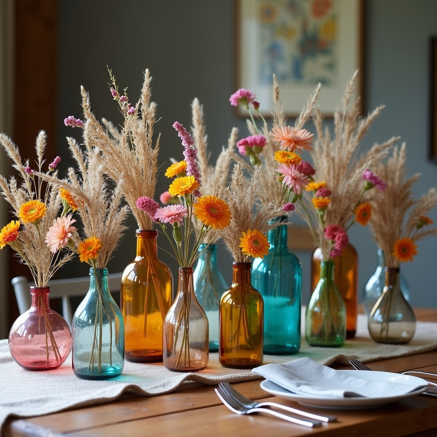 An assortment of colorful glass vases filled with dried flowers creates a lively yet cozy centerpiece. Varying heights and tones add depth and personality to the table.