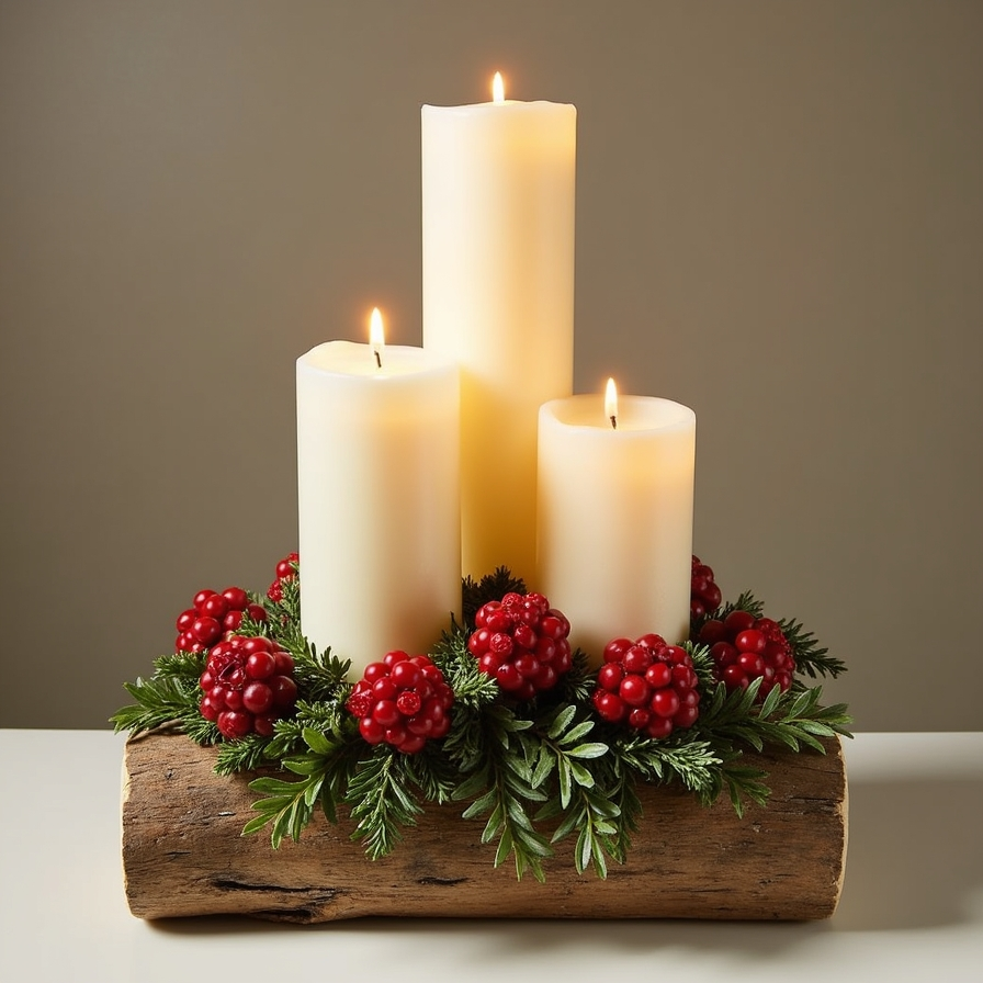 A wooden log base forms the foundation of this rustic centerpiece. Tall ivory candles rise above clusters of red berries and greenery, creating contrast and warmth.