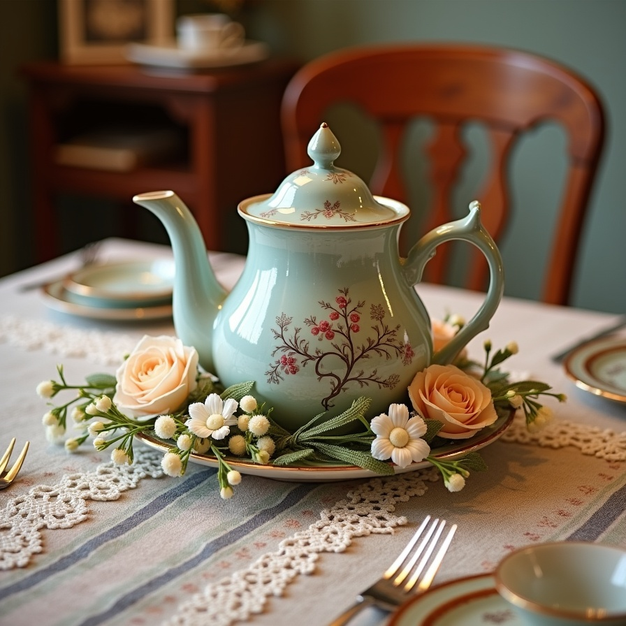 A charming vintage teapot serves as the focal point of this nostalgic table setting. Surrounded by delicate floral accents and lace details, the arrangement evokes warmth and tradition.