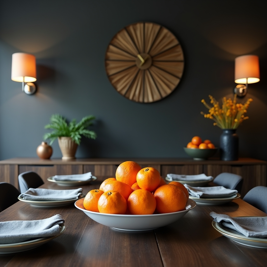 A bowl of fresh oranges becomes a vibrant centerpiece in this contemporary dining room. The bright fruit contrasts strikingly with the dark surroundings, adding energy and freshness.