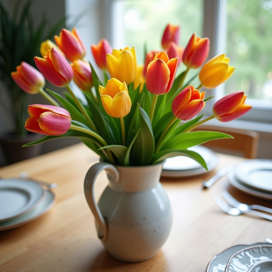 Colorful tulips arranged in a ceramic pitcher create a lively yet relaxed centerpiece. The mix of flower heights adds dimension, while the pitcher’s casual charm keeps the look approachable.