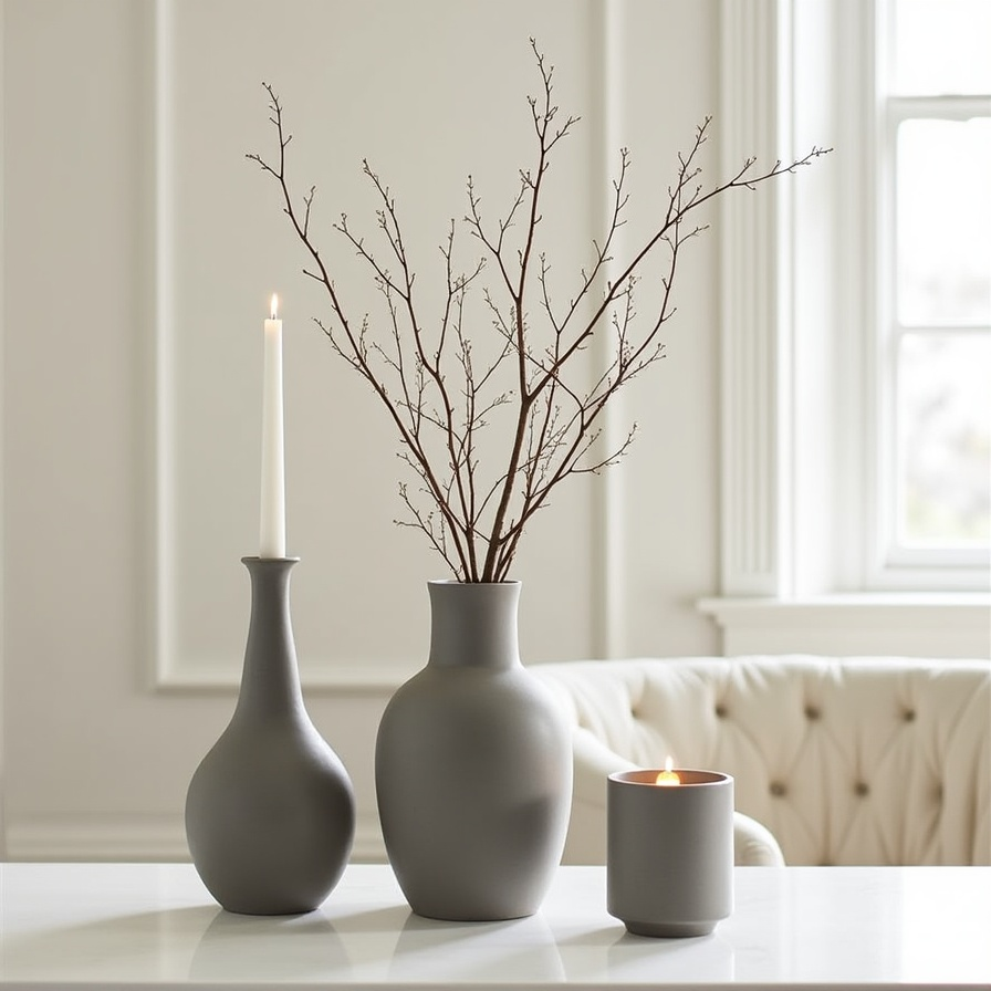 Three matte-finish vases filled with delicate branches create an airy, sculptural effect. Positioned at varying heights, they introduce subtle drama without clutter.