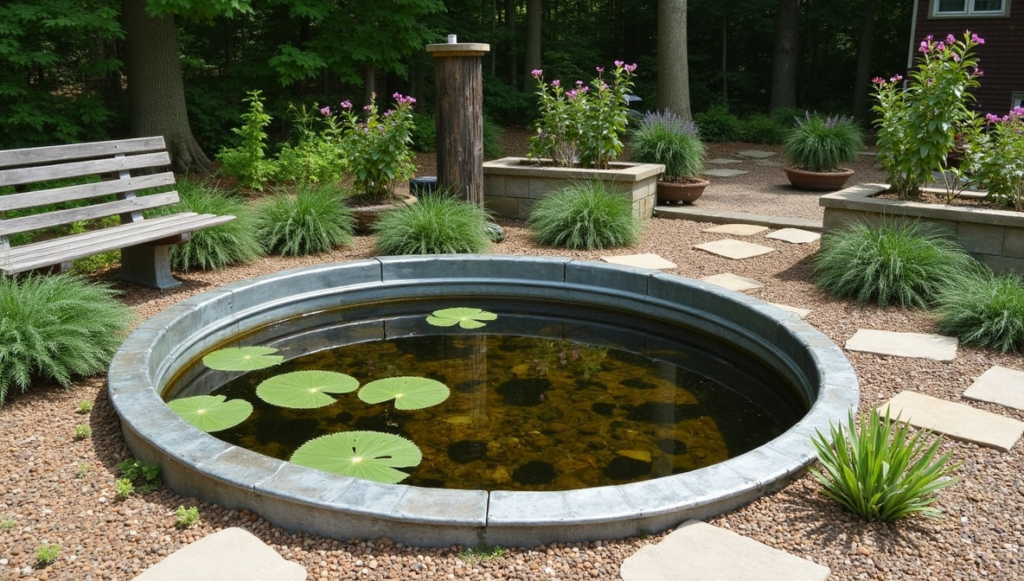 A galvanized or black poly stock tank makes a versatile, low-maintenance pond for patios or gravel pads. After leveling the area, rinse the tank and add a submersible pump feeding a small fountain or stainless steel spillway.