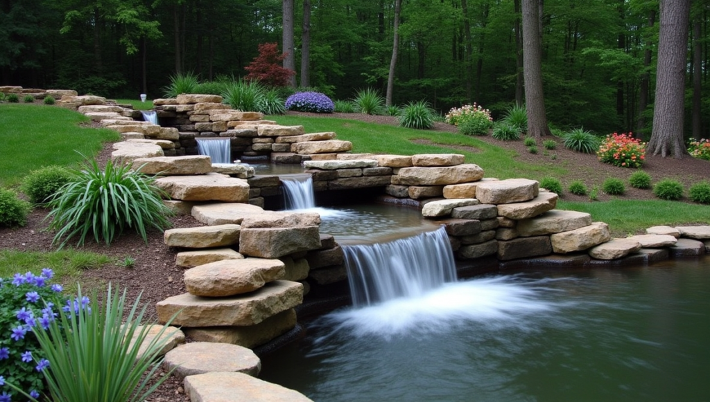 Moving water discourages mosquitoes, enhances lily growth, and adds visual and auditory appeal. Illuminate the cascade at night with warm-white lighting to create a captivating feature.