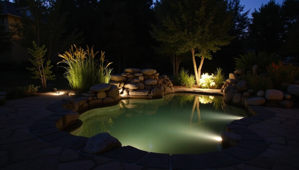 Proper lighting transforms a backyard pond into a nighttime showpiece. Use a GFCI outlet with a low-voltage 12V transformer in weatherproof housing. Route cables in conduit with drip loops for safety. Combine underwater spotlights, rock-grazing puck lights, and warm-white LEDs to enhance stones and plants, with optional solar path lights for off-grid corners.