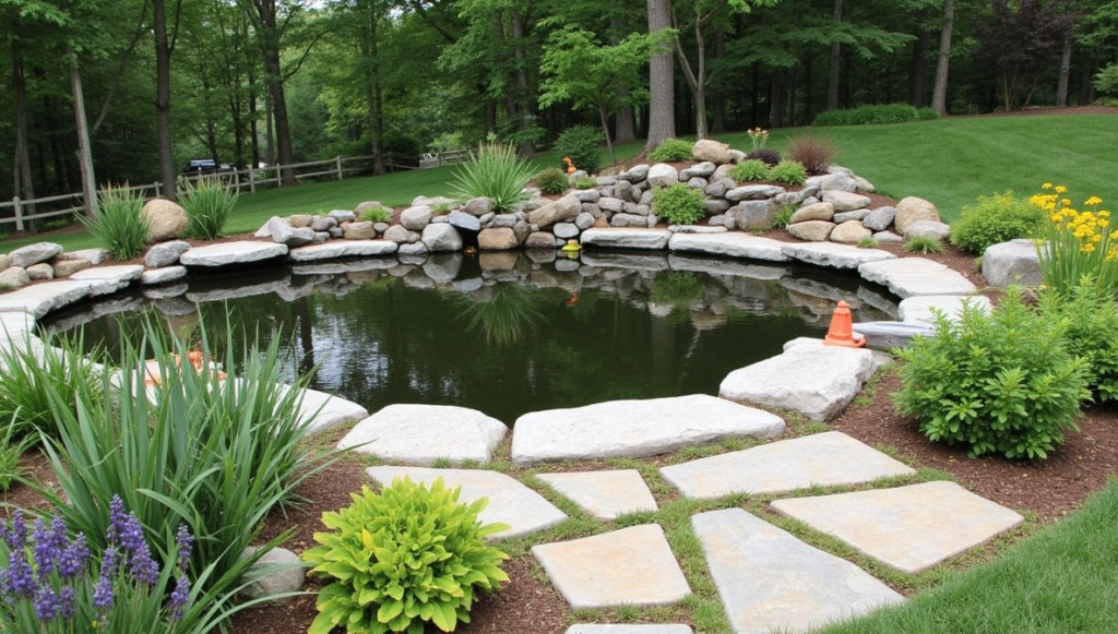 Design your pond to support wildlife with gentle shelves and a gravel “beach” ramp for frogs, toads, and insects. Include a basking rock and a partially submerged log to attract dragonflies and pollinators. Use native marginal plants such as blue flag iris, soft rush, cardinal flower, swamp milkweed, and pickerelweed to provide natural filtration and habitat.