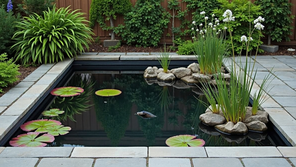 Shallow mirror ponds provide dramatic reflections in compact spaces. Use a black liner or pond dye with a crisp rectangular shell and coping stones for a polished look. Subsurface returns maintain a calm, reflective surface. Keep planting minimal: a dwarf lily, a few architectural clumps like dwarf papyrus or corkscrew rush, and a single vertical accent.