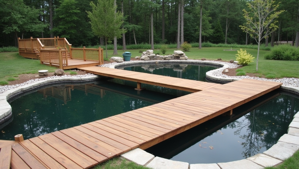 Integrate ponds with living spaces by extending decking over the water. Cantilevered boardwalks or platforms provide seating and visual connection while keeping the liner intact. Secure the liner with compression strips and flashing, then cap with decking for a seamless finish.