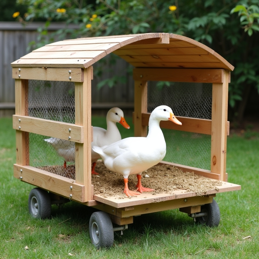 Cover the frame with chicken wire or hardware cloth to ensure safety and airflow. Adding a small shaded shelter inside will protect ducks from direct sun and rain. The key advantage of this design is its portability, allowing you to relocate it regularly. It is especially useful for maintaining a clean environment while giving ducks constant access to fresh grass and insects.