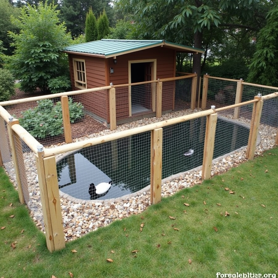A pond-side duck enclosure is perfect for owners who already have a garden pond. Begin by placing sturdy wooden posts around the pond’s perimeter to form a secure boundary. Attach chicken wire or mesh fencing between the posts to create a safe enclosure that allows ducks to enjoy the water without escaping or being exposed to predators.