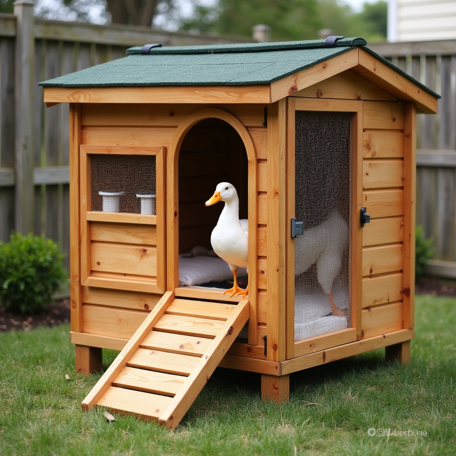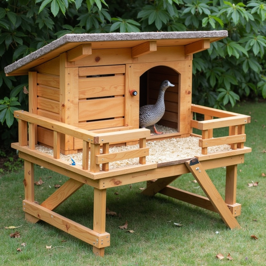 Include ventilation holes to maintain airflow inside the house. A small door and ramp should be added for easy duck access. Inside, use straw bedding for warmth and comfort. This design is durable, reliable, and ideal for long-term use in various weather conditions, offering both safety and comfort for ducks.