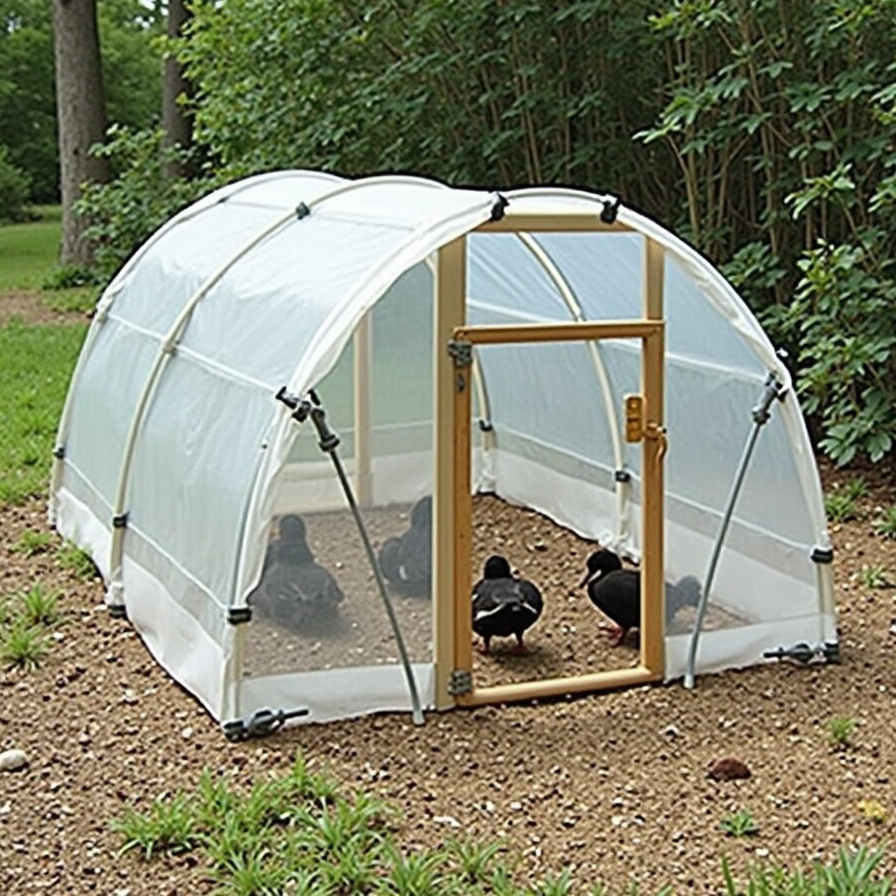 Add a tarp or greenhouse plastic over the top for weather protection. Ground stakes should be used to secure the structure firmly, especially in windy conditions. Include a small gate for easy access. This design offers a simple yet effective solution that balances protection, airflow, and affordability for everyday duck care.