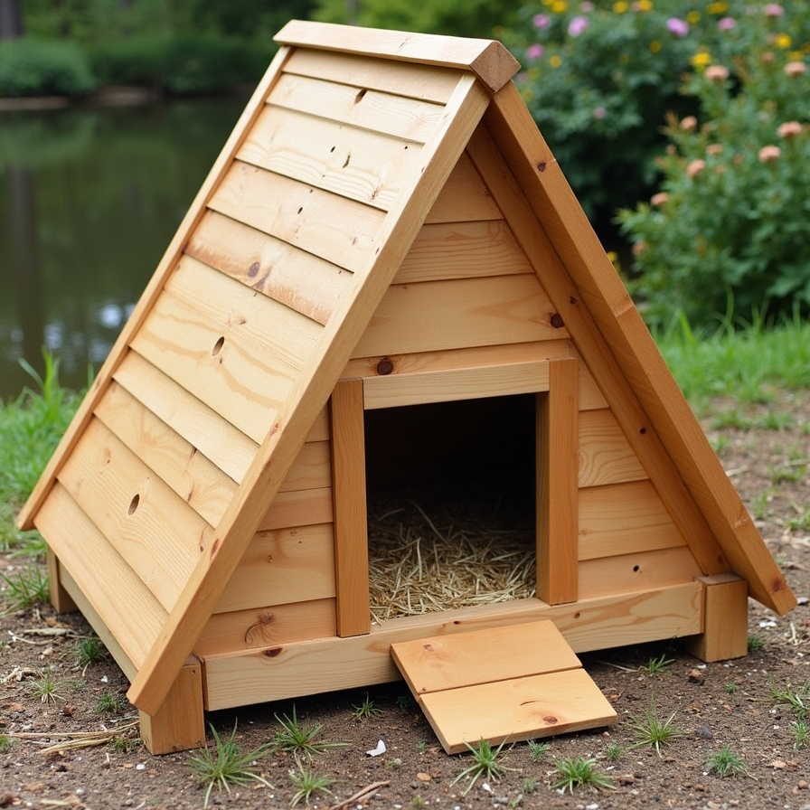 The wooden A-frame duck house is a sturdy and visually appealing shelter design. Start by building a triangular A-frame structure using solid wooden planks. This shape provides natural strength and efficient water runoff during rain. Cover the sides with plywood or weather-resistant panels for protection.