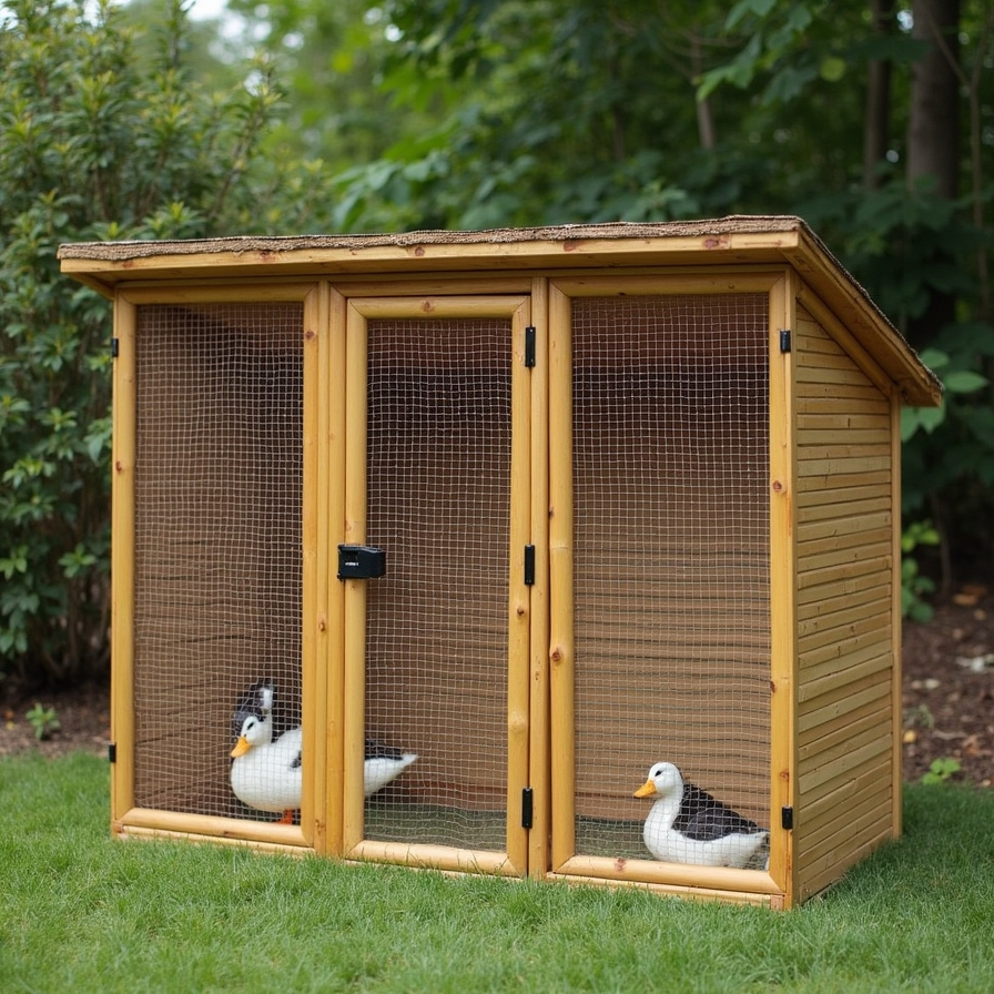 A bamboo duck enclosure is an eco-friendly and natural-looking housing option. Start by building a rectangular frame using strong bamboo poles. Once the frame is secure, attach woven bamboo panels or mesh to form the walls. This creates a lightweight but sturdy structure.